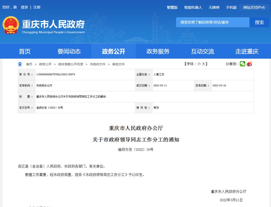 重慶市的市委書記和市長進行了調(diào)整,新的市委書記和市長都是經(jīng)驗豐富的領(lǐng)導干部,他們在工作中表現(xiàn)出色,深受人民群眾的喜愛和信任,他們的到來將為重慶市的發(fā)展注入新的動力和活力。